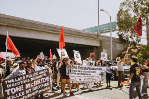 Other speakers included: Black Lives Matter – LA; Centro CSO; Centro CSO Youth; Lisa Vargas, mother of Anthony Vargas (killed by East LA sheriff’s deputies in 2018); the family of Cesar Rodriguez (killed by Long Beach PD in 2017); the family of Alex Flores (killed by LAPD in 2020). U.S. Palestinian Community Network (USPCN); the family of Enrique Roman-Martinez (murdered on-duty in the army in 2020 while on a camping trip with other soldiers); Los Angeles Indigenous Peoples Alliance (LAIPA), the daughters of Jose Tapete, an immigrant held in the Adelanto Detention Center for over two years; Alex Orellana of Centro CSO; Cholo Scarr and Heron Carrillo of United Brown Coalition.
