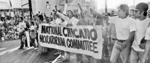 The Chicano Moratorium of 1970 was a massive demonstration organized by students, Mexican farm and industry workers, and civil rights activists. This and preceding mass actions such as the Chicano “blowouts” of 1968, gave momentum to what became a broader Chicano Movement which promoted self-determination and social justice. Politically, this movement was influenced by Black, Indigenous, Marxist and Feminist radical thought and movements.